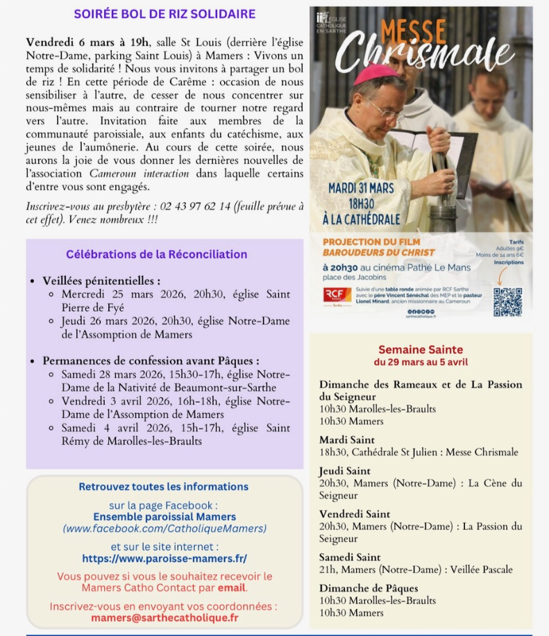 Trois Catéchumènes (Patricia / Nora / Roxane), de notre Ensemble Paroissial de Mamers et du Saosnois, ont été appelées le 21 Février 2026 à l'Appel Décisif célébré à la cathédrale du Mans. Elles poursuivent leur cheminement spirituel vers les sacrements de l'initiation chrétienne.
